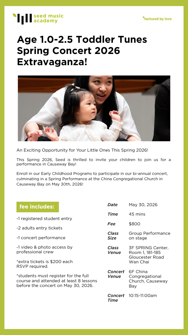 Students must be enrolled into our Suzuki Pre-Instrumental Programme 8 lessons prior to participate in this performance.