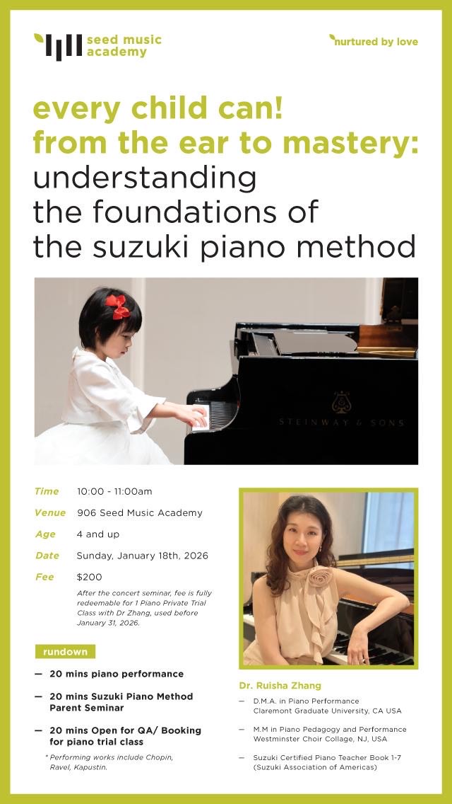 Dr. Zhang is a dedicated pianist, educator, and Suzuki-trained teacher with 16 years of experience in both performance and pedagogy. Committed to nurturing young musicians, she blends her performance background and academic research to foster each student’s musical growth. Her teaching philosophy is rooted in the Suzuki Method, which she has studied through Book 6 with Sachiko Isihara, Faye Adams, and Diana Galindo. Believing that every child can thrive musically in a nurturing and structured environment, she integrates Suzuki principles—listening, repetition, and encouragement—with traditional approaches to develop not only technical and expressive skills, but also confidence, discipline, and a lifelong love for music.